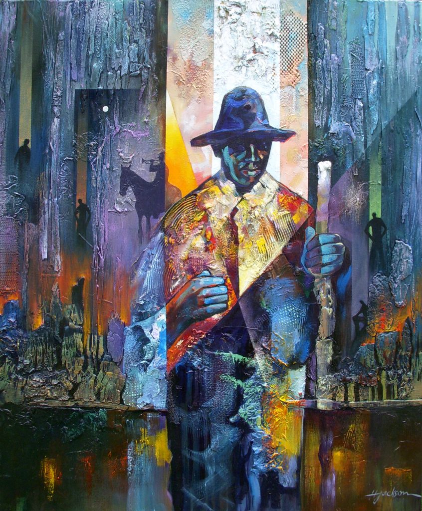 In deep blue and green tones, Jackson gives the often lost and forgotten a face and presence.  Jackson said about the faces that he created in these two portraits: “While a lot of my work is more abstract, with these I wanted to show the faces. They could be people of today. They look like the people I have known all my life.”