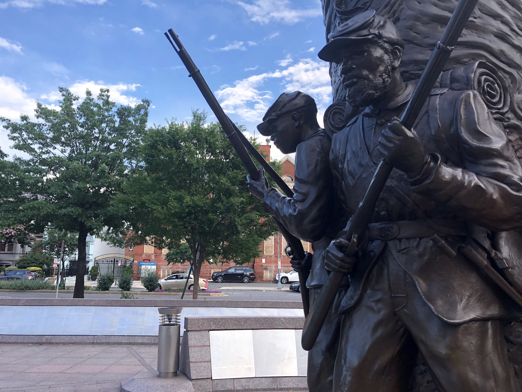 At 9 feet tall and cast in bronze, the Ed Hamilton work features four soldiers standing shoulder-to-shoulder forming a semi-circle. Three of the four soldiers are members of the United States Colored Troops, and the fourth is a U.S. Navy sailor.  The statue is only part of the memorial that was finished in 1997. Behind it is a curved walkway with the inscribed names of the nearly 222,000 (correct) African-Americans who served in the military during the Civil War.