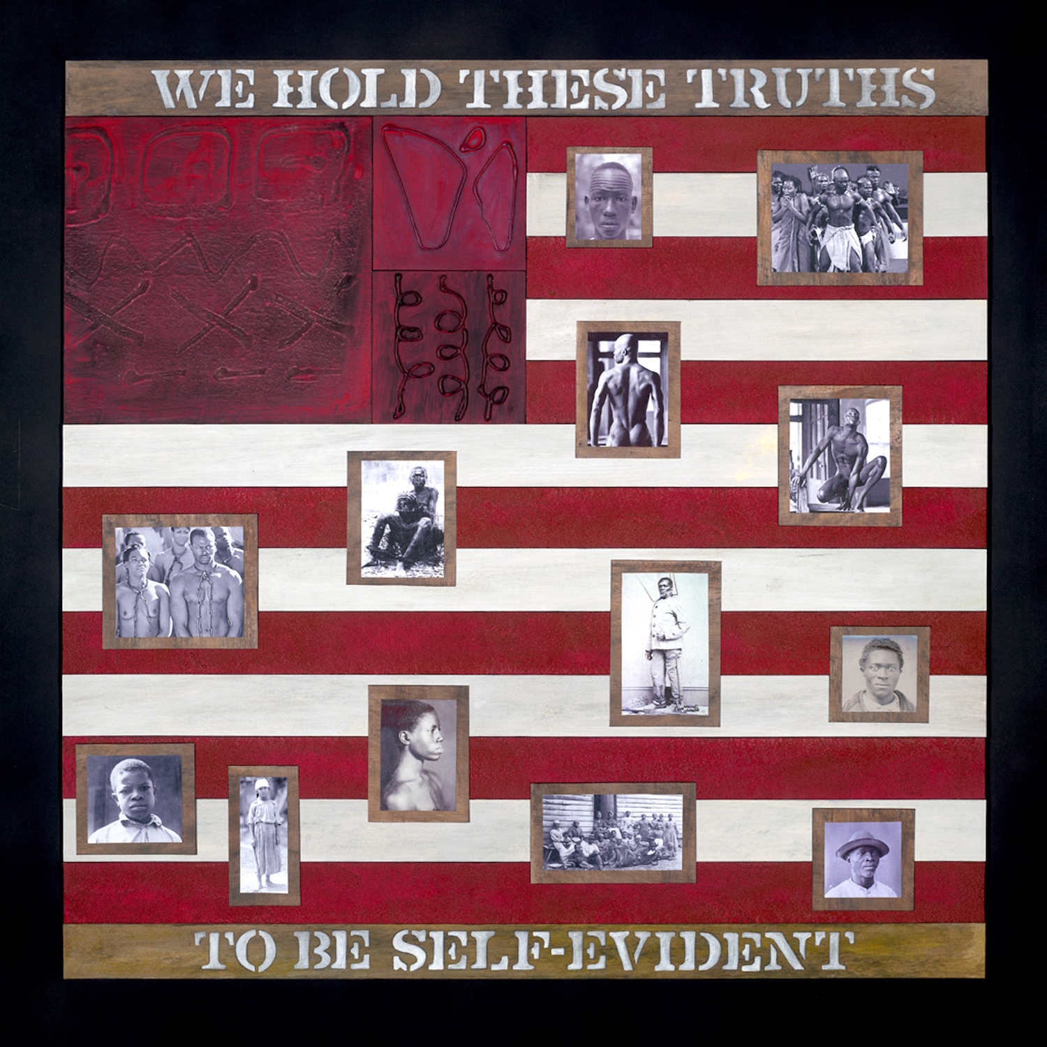 Wood’s exhibition presents eight different works, all beautifully framed and available for purchase. There are familiar faces and images, and then there are ones that draw you in for deeper inspection. “We Hold These Truths” is a well-executed juxtaposition piece of the American flag, with the stars that originally represented the 13 original colonies replaced by 13 photos showcasing the horror of America’s original sin, slavery. The deepness of the red used takes on new meaning in Wood’s reimagining; blue has been replaced by different symbols cast in the same dark crimson paint. At the top and bottom of the work, the thickly lettered words “We Hold These Truths to Be Self-Evident” hammer home this critique of America’s past.