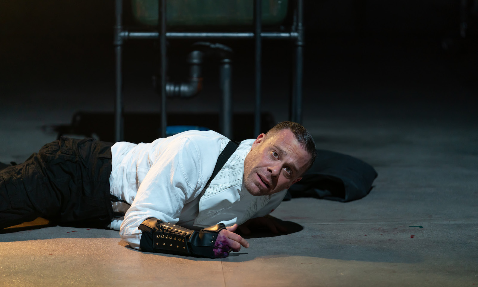 This production is contemporary, but avoids the limiting trope of tying Richard to any one moment or figurehead. Costume designer Murell Horton’s clean-cut gray suits and neutral gowns feel austere and timeless. Debra Booth’s chilling set places us in an abattoir of gray, rusting walls and industrial machinery, lit by an enormous operating-room light — anywhere’s underbelly.