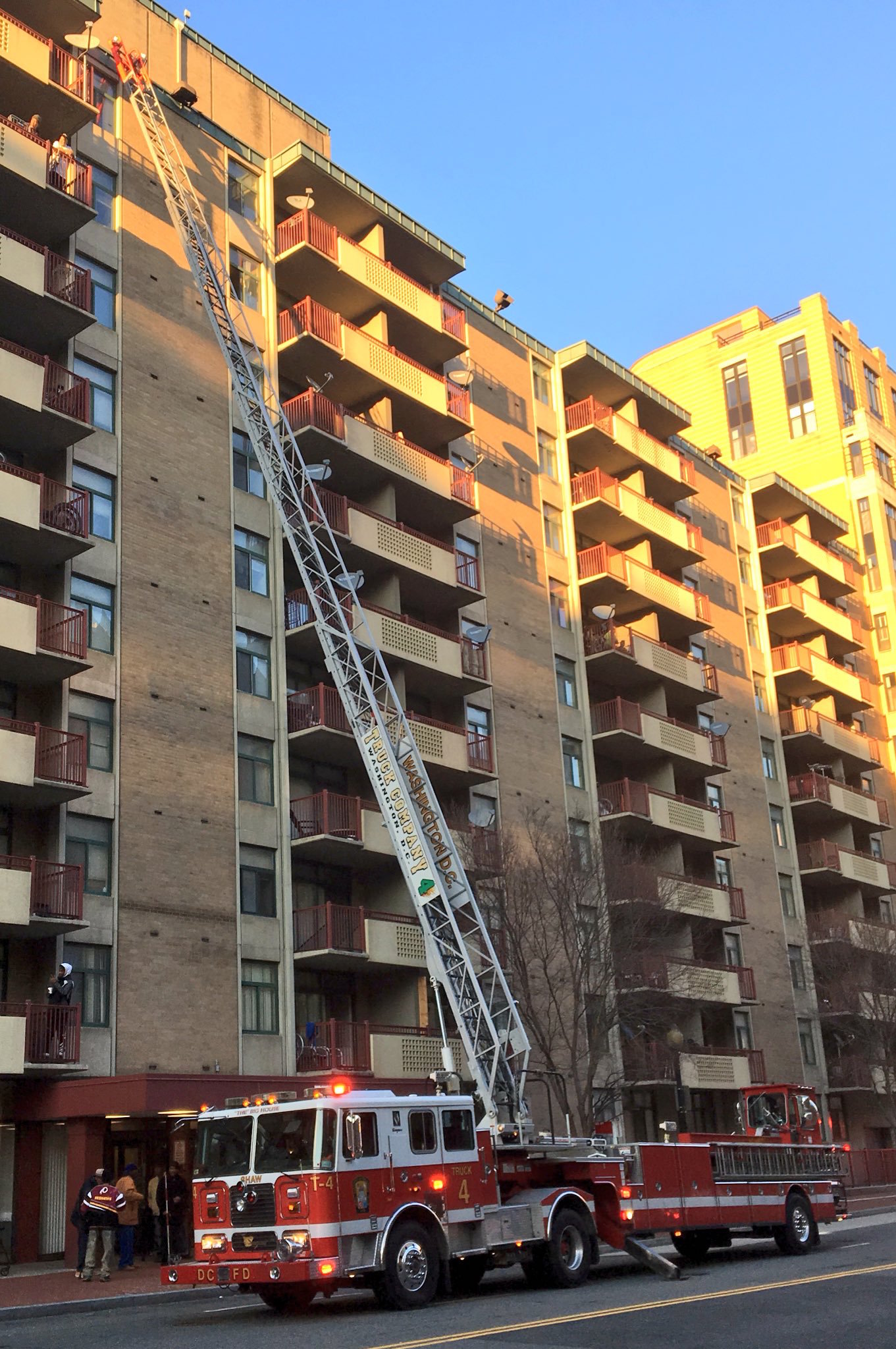 Shaw’s Truck 4 responded to a March 4 fire on the eighth floor of a 10-story apartment building in the 1200 block of M Street NW. One resident was displaced, but no injuries were reported. (Photo courtesy of the DC Fire and Emergency Medical Services Department via Twitter)
