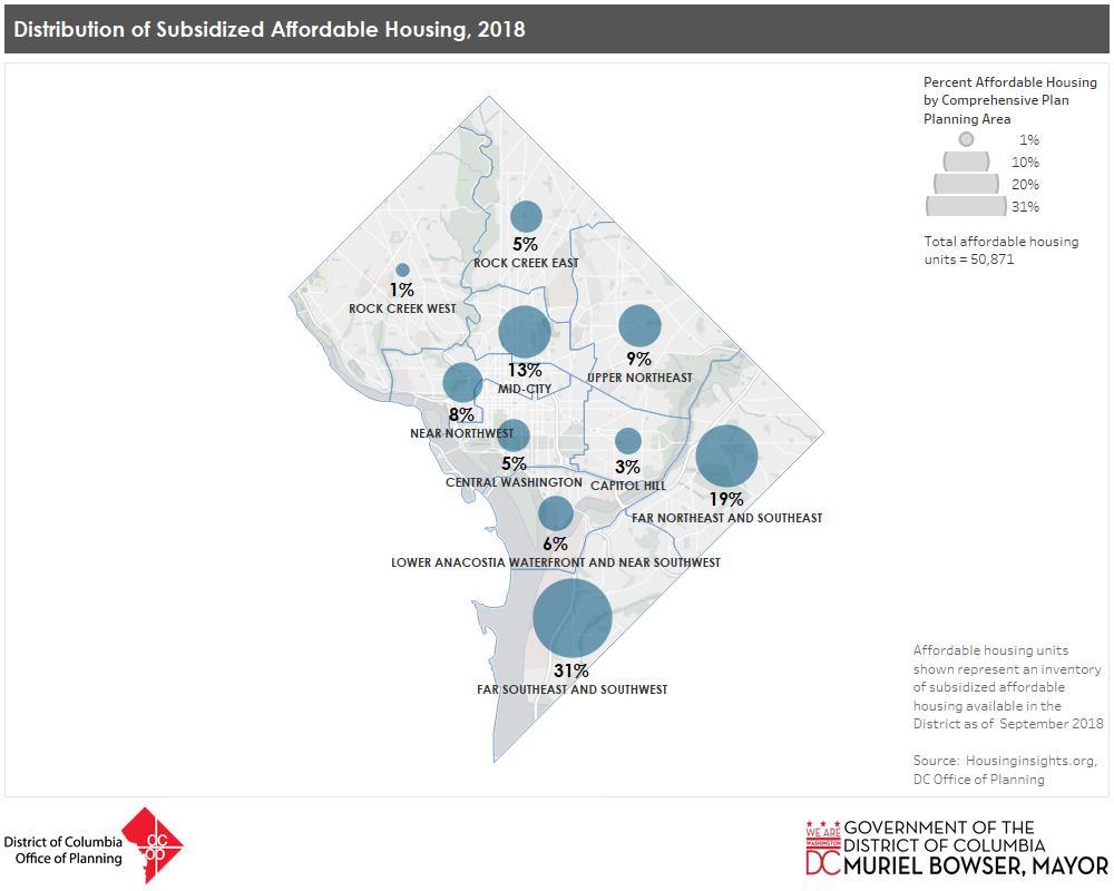Bowser said that the summer meetings will be a chance to “put everything we know on the table” and solicit new ideas from the public. The Office of Planning will hold meetings in 10 planning regions. One of those areas — “Rock Creek West,” which includes all of Ward 3 — was home to just 1 percent of the 50,871 subsidized affordable housing units in the city as of September 2018, according to the agency. The Far Southeast and Southwest region meanwhile accounted for 31 percent of the city’s total last year, with another 19 percent built in Far Northeast and Southeast.
