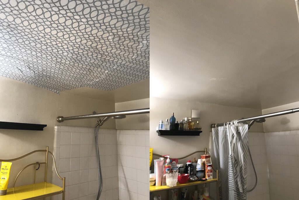 At left, the bathroom ceiling is shown covered with sheeting Salvador put up himself the week of Nov. 18. (Photo courtesy of Felipe Salvador). At right, the ceiling is shown after having been fully repaired on Jan. 23. (Photo by Avi Bajpai)