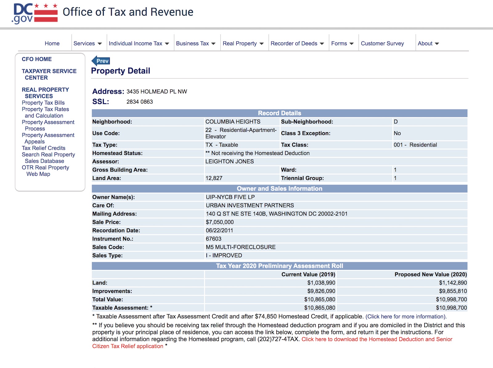 Since 2004, DCRA has received 51 property-code violation complaints from residents in the Holmead Place building, none of which pertain to the issues described in this article. Of those, 31, or roughly 60%, occurred after 2011, when UIP bought the building for a foreclosure price of $7.05 million and took over management. The current assessed value is $10.87 million, according to the District’s property tax database. UIP’s website lists rents for the three available units as $1,462 for a studio and $1,609 for a one-bedroom unit.