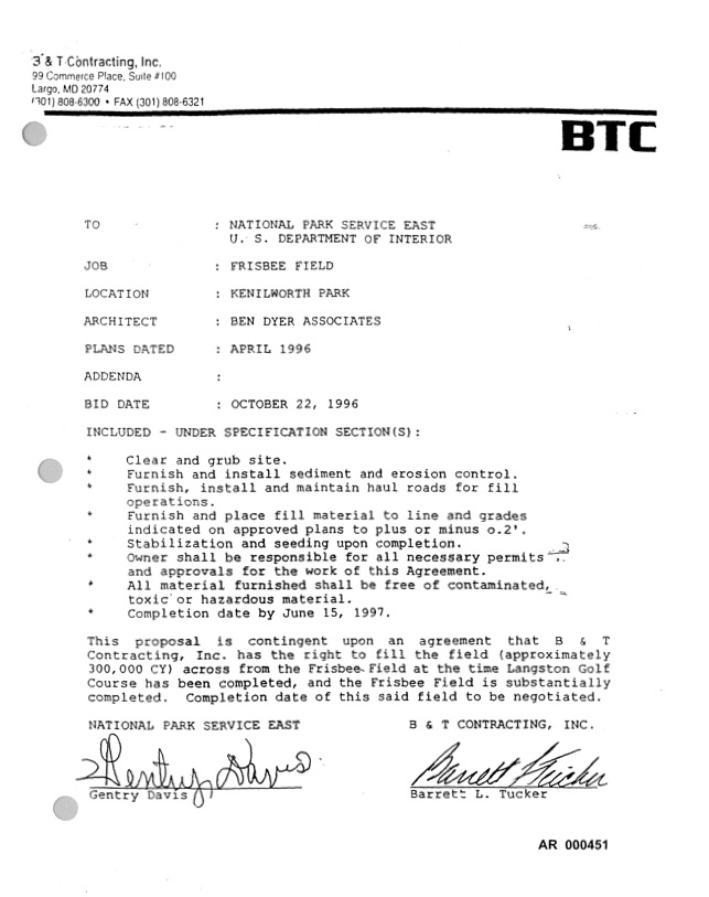 The stipulation can be found in a document signed by Gentry Davis of the National Park Service and Barrett Tucker of B&T Contracting Inc., a trucking company. Another Maryland-based company, Driggs Corp., also dumped at the park during this time, although its agreement with NPS did not explicitly forbid the dumping of hazardous materials, according to The Washington Post.