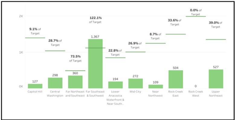At the start of her second term, Mayor Bowser set a bold goal to deliver an additional 36,000 units of housing – including at least 12,000 units of affordable housing – by 2025. By further equitably distributing these goals across the District’s ten planning areas, Mayor Bowser made DC the first jurisdiction in the nation to create affordable housing goals by neighborhood. With 16,550 new housing units delivered since January 2019, the District has reached 46% of that goal. During that same period, 3,758 affordable units have also been delivered, which represents 31% progress toward the affordable housing goal. You can track the District’s progress toward #36000by2025 at open.dc.gov/36000by2025
