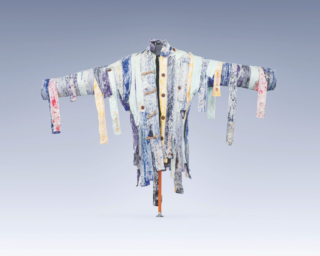 The anchor piece of the exhibition, Terrence Nicholson’s Safety Jacket: A Mourning in Chinatown (2018), reflects the ongoing changes in Chinatown. In this mixed-media work, the African American artist expressed his grief over the eviction of the Wah Sing Kung Fu School by creating a kung fu jacket from martial arts sashes. The jacket’s resemblance to a scarecrow — usually used to keep birds away from crops — invites speculation: Is it meant as a deliberate symbol of protection, loss and deterrence, or is it just a coincidence? The ambiguity adds depth to the narrative of displacement and cultural erosion.